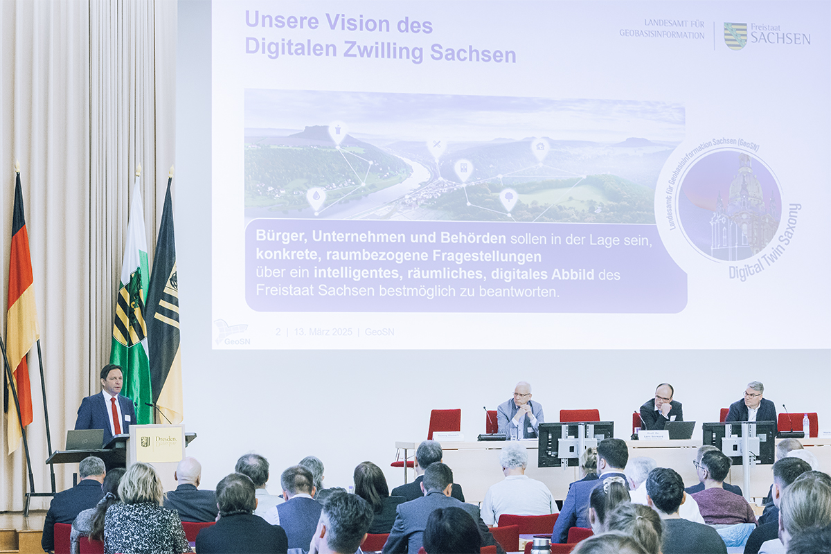 Die Einführungsvorträge hielten Ronny Zienert, Präsident des Landesamtes für Geobasisinformation Sachsen (GeoSN), zum Thema „Digitaler Zwilling Sachsen“ und
